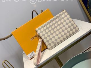 ダミエ・アズール キャンバスにゴールドカラーのリベットをあしらった「シティ・ポシェット」。ダミエ・パターンを傾けて、夏に相応しくフレッシュにアップデートしました。さまざまなスタイルをお楽しみいただける、取外し可能なリストストラップ付き。