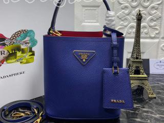 アイコニックな「サフィアーノ」レザーの質感が特徴のコンパクトなプラダ パニエ バッグ。シングルハンドルの上品なデザインで、トップのストラップ開閉が際立ちます。